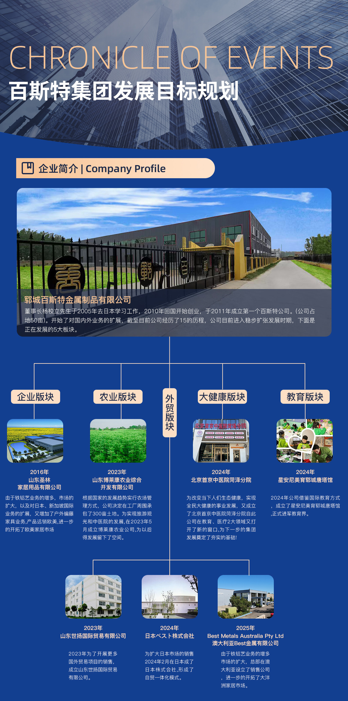 鄆城百斯特金屬制品有限公司位于山東鄆城,東接京九鐵路,南接日東、濟廣高速,交通便利。公司占地30000平方米,是專業生產和銷售鐵藝制品、鋁藝制品、不銹鋼制品、藤鐵家具、鋼木家具、農業設備等綜合性企業,擁有雄厚的技術力量,先進的生產設備,專業的研發隊伍,并建立嚴謹的管理制度,形成了富有特色的企業文化。...